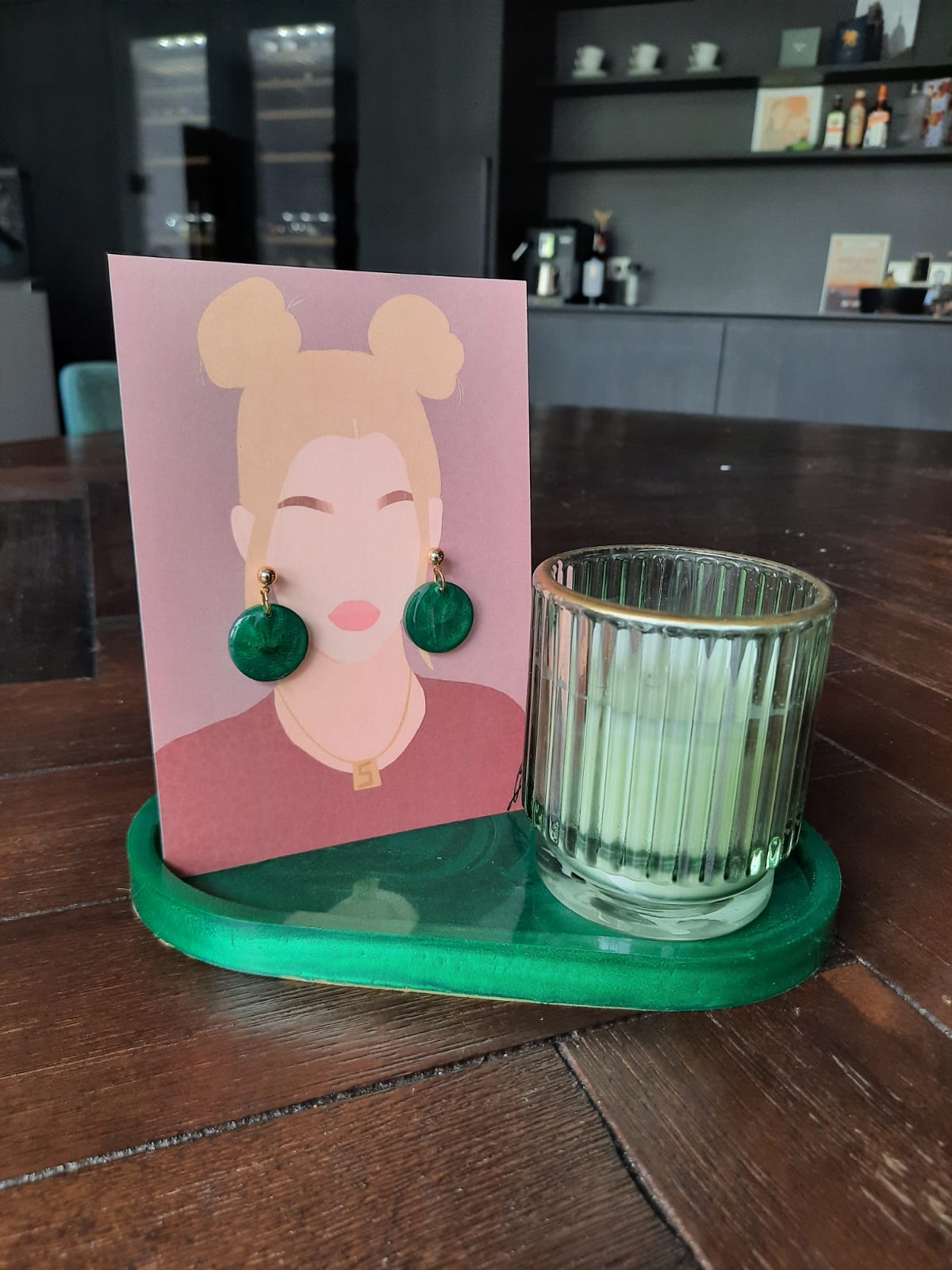 leuke set van een paar oorbellen en een kaars op een bijpassend schaaltje.